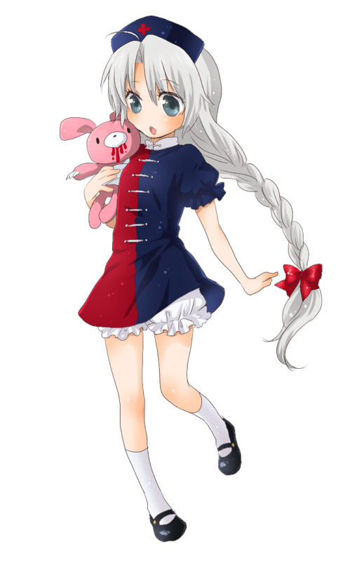 1girladapted costumeaged downbloomersblue eyesbowbraidchildfemale focusfull bodygreen eyeshair bowhatlong hairmary janesribbonshoessockssolostandingstuffed animalstuffed rabbitstuffed toyunderwearvery long hairwhite bloomerswhite socks