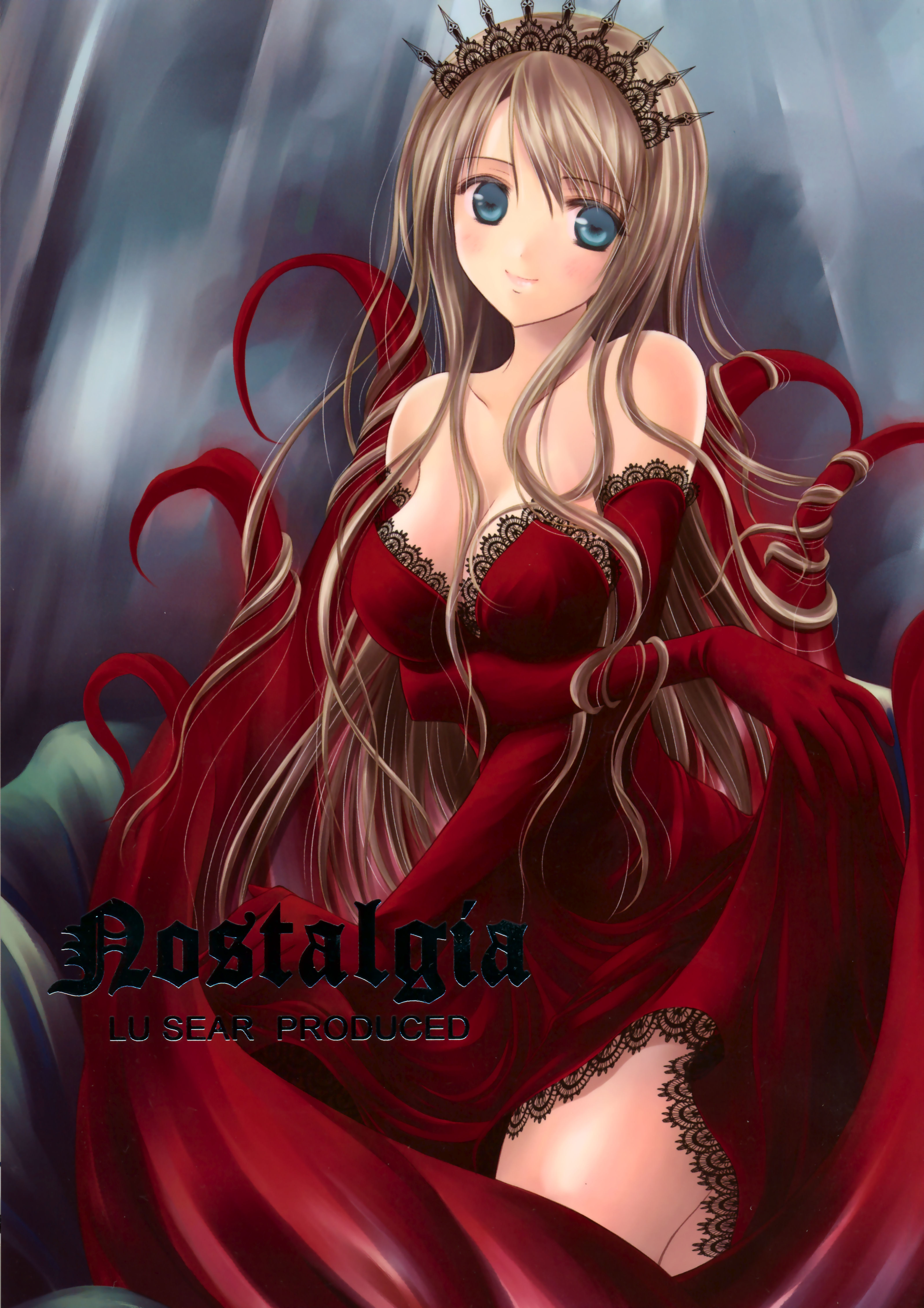 1girlbare shouldersblue eyesbrown hairclothes liftcrowndressdress liftelbow glovesfemale focusfrillsgloveslong hairred dresssmilesolo