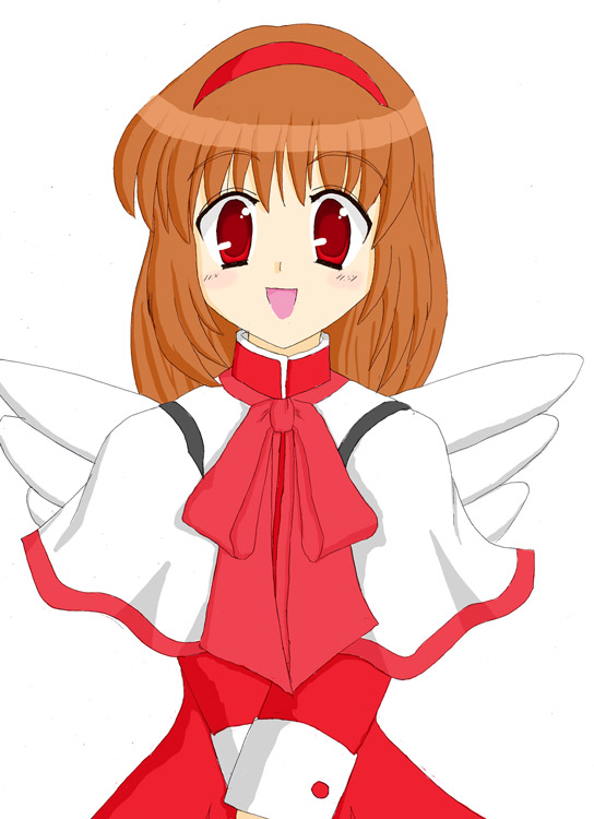 ae h1ryu, kanoe (blue archive), blue archive, 1girl, black dress, brown eyes, brown halo, collared shirt, dress, fang, grey hair, hair over one eye, halo, hands up, long hair, looking at viewer, neck ribbon, open mouth, pinafore dress, red ribbon, ribbon, shirt, simple background, skin fang, sleeveless, sleeveless dress, solo, white background, white shirt