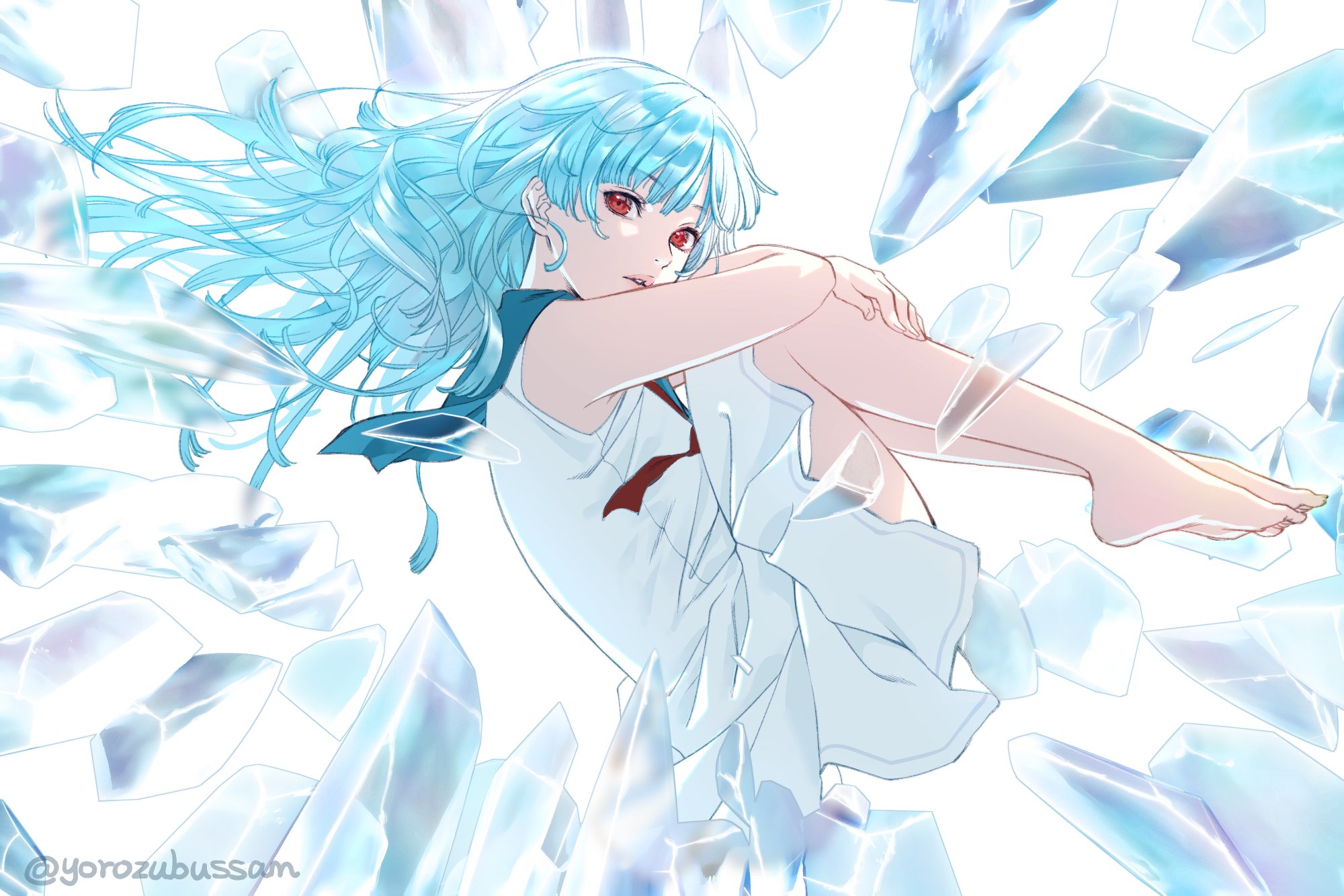1girlbarefootbloomblue hairblue sailor collardressfetal positionfloatingfull bodyicelong hairlooking at viewerred eyessailor collarsailor dressshatteredsolotwitter usernamewhite dress