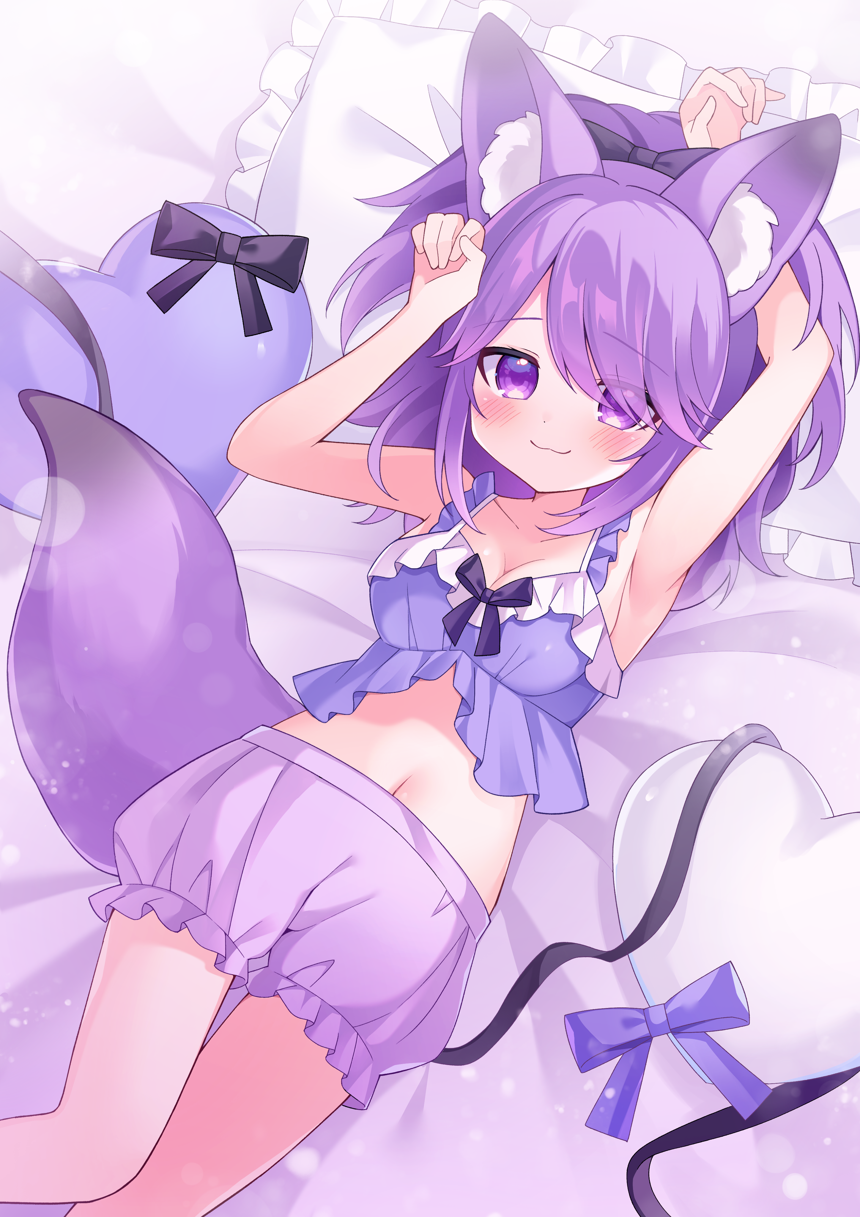1girlanimal ear fluffanimal earsbloomersblushbreastsclosed mouthfox earsfox girlfox taillooking at viewerlyingmedium breastsmedium hairnavelon backpillowpurple bloomerspurple eyespurple hairsolotailunderwearvirtual youtuber