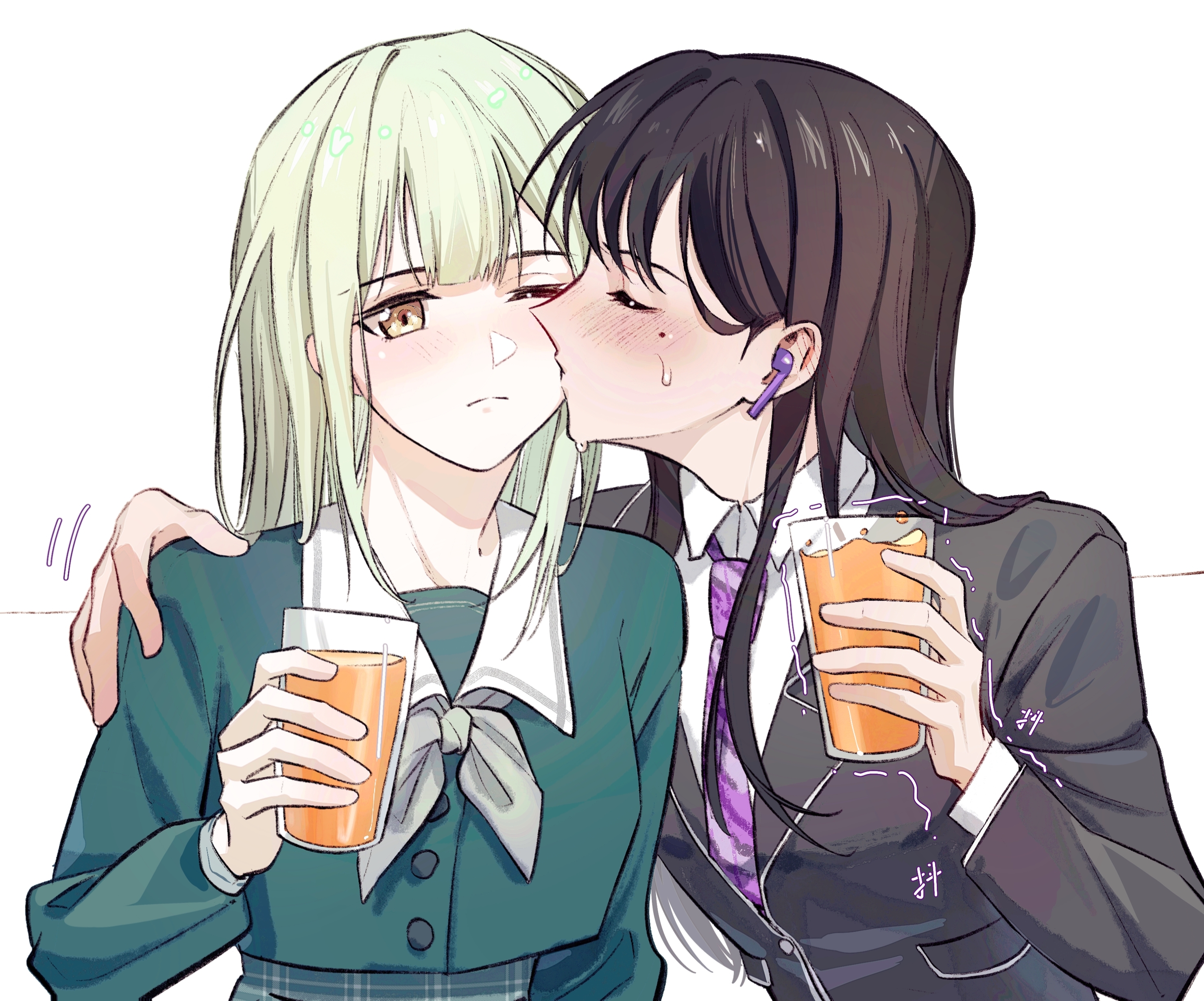 2girlsblack hairblack jacketblue shirtblushcupdiagonal-striped clothesdiagonal-striped necktieear blushgreen hairgrey neckerchiefhaneoka school uniformholdingholding cupjacketkisskissing cheeklong hairlong sleevesmolemole under eyemultiple girlsneckerchiefnecktiepurple necktieschool uniformshirtsimple backgroundstriped clothessweatdroptremblingtsukinomori school uniformwhite backgroundwireless earphonesyellow eyesyuri