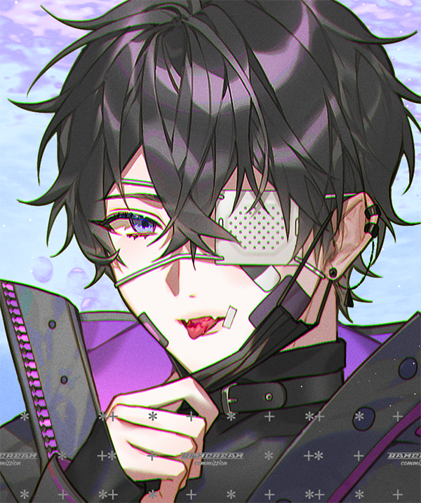 1boybandaidbandaid on cheekbandaid on faceblack hairblack shirtblue eyesear piercingeyepatchfangshair between eyeslong sleeveslooking at viewermale focusmaskmask pullmessy hairmouth maskopen mouthpiercingshirtshort hairskin fangssolotonguetongue out