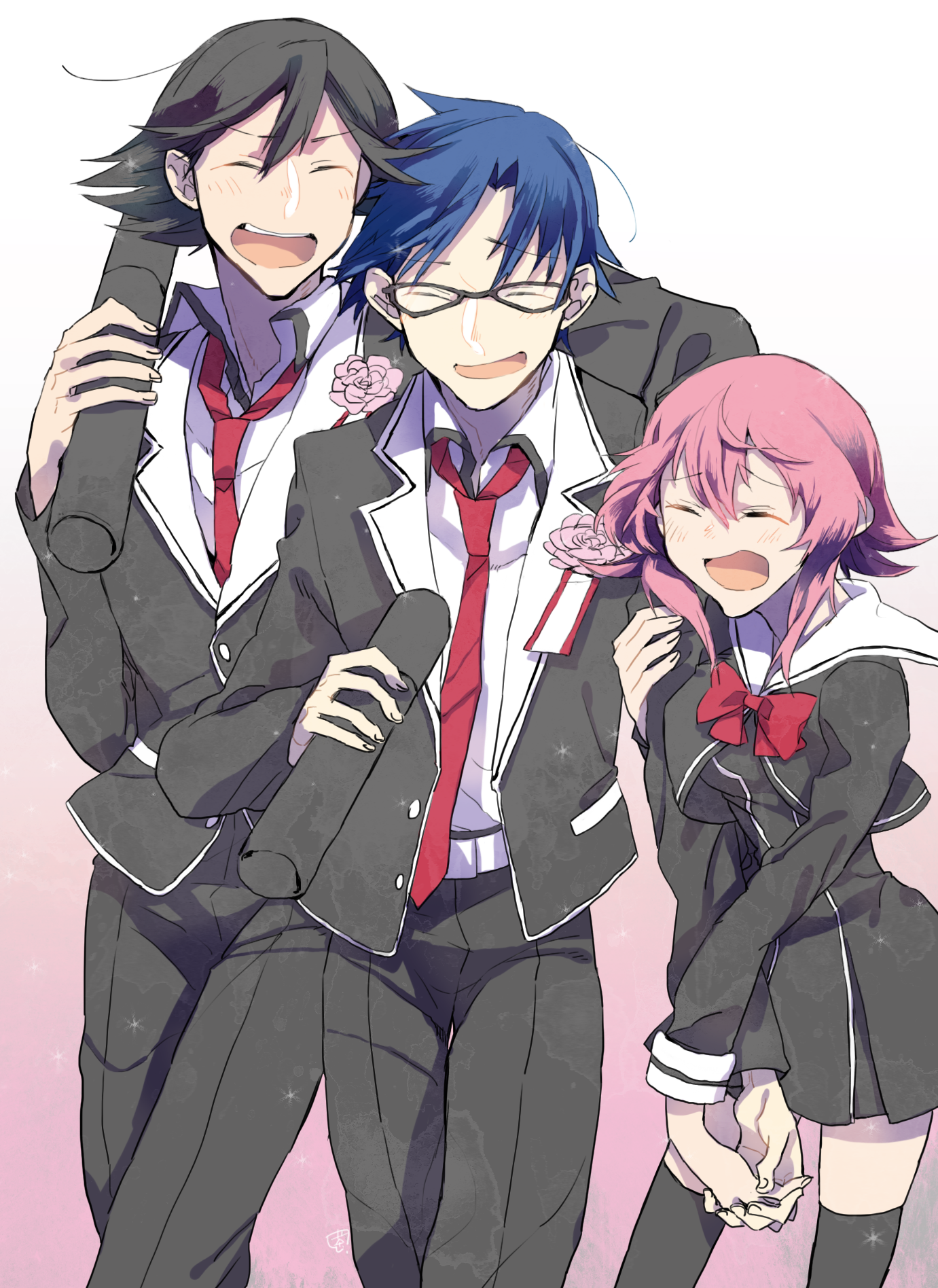 1girl2boysahogeblack hairblack jacketblack pantsblack thighhighsblue hairblushbowbuttonschest bowcollared shirtcropped jacketdiploma tubedouble-breasteddress shirtdress vestglassesgraduationhand grabhekiho academy school uniformholdingholding tubeitou shinji (chaos;child)jacketlapelslong sleevesloose necktieminiskirtmultiple boysnecktienotched lapelsopen clothesopen collaropen jacketopen mouthpantspink hairred bowred necktiesailor collarschool uniformshirtshort hairshort hair with long locksskirtthighhighstonguewhite sailor collarwhite shirt