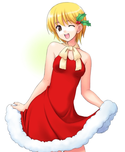 1girlblonde hairchristmasdressfemale focushair ornamenthollyholly hair ornamentmistletoeone eye closedopen mouthribbonsanta costumeshort hairsolounknownwink