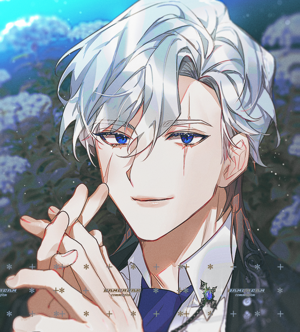 1boyblue eyesblue necktieclosed mouthcollared shirtlooking at viewermale focusnecktieown hands togetherparted bangsportraitshirtshort hairsmilesolowhite hairwhite shirt
