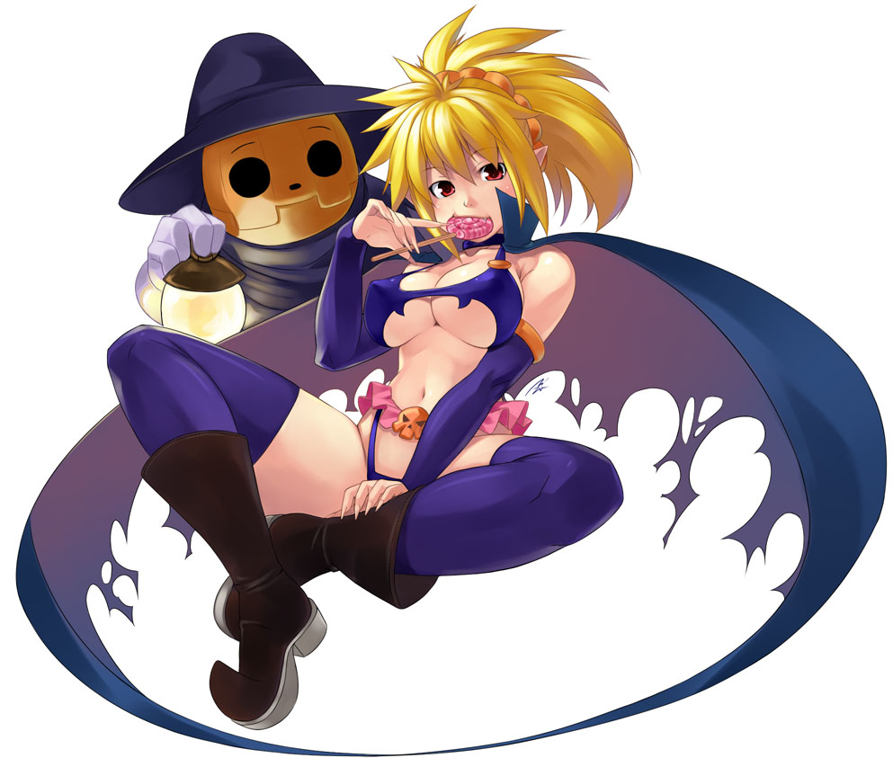 1girlblonde hairbreastscandycapecovered erect nipplesdetached sleevesfangfemale focusfoodhalloweenlarge breastslollipoplong hairpointy earsred eyessoloswirl lollipopthighhighsunderboob