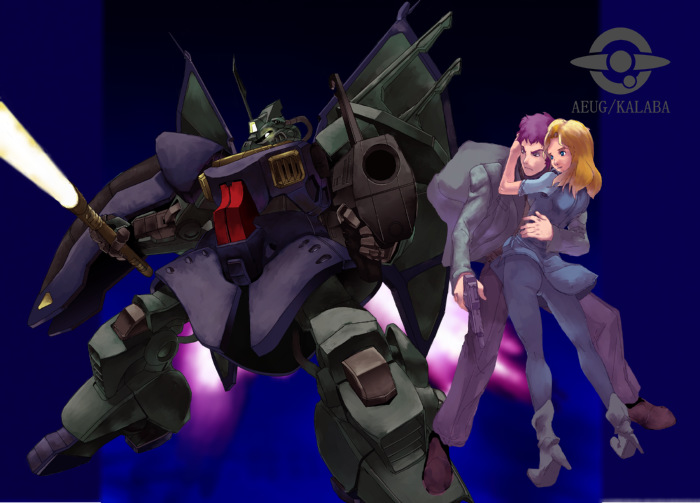 1boy1girlblazerblonde hairbootscoupleenergy swordgunheteroholdingjacketmechamsk-008 dijehpantspurple hairrobotswordweapon