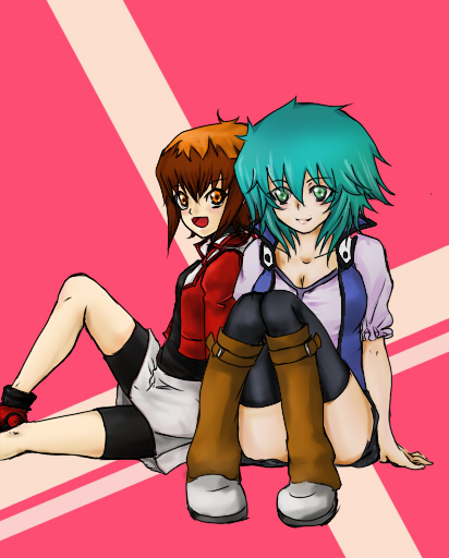 2girlsaru toblue hairblushbootsbreastsbrown eyesbrown haircleavagefemale focusgenderswapgenderswap (mtf)green hairlong hairmedium breastsmultiple girlsobelisk blue uniformosiris red uniformschool uniformshort hairskirtsmilethighhighs