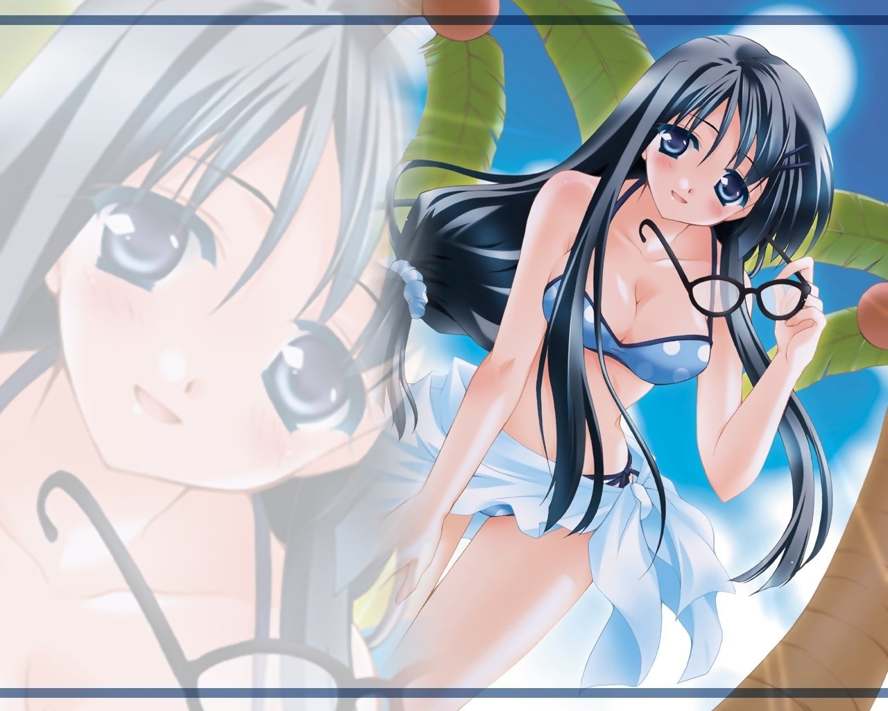 bikiniblue eyesblue hairfrom belowglasseslong hairlooking downpalm treesarongsoloswimsuittreezoom layer