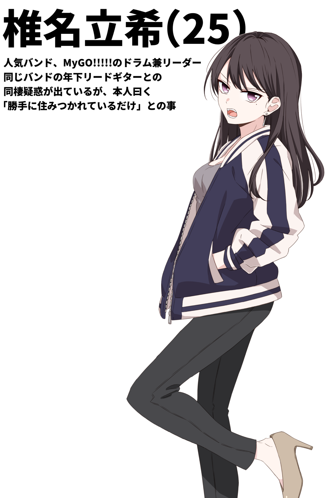 1girlaged upblack hairblack pantsblue jacketbreastsbrown shoesearringsgrey shirthands in pocketsjacketjewelrylong hairlooking at viewermedium breastsmolemole under eyeopen mouthpantspurple eyesshirtshoessimple backgroundsoloteethwhite backgroundzipper