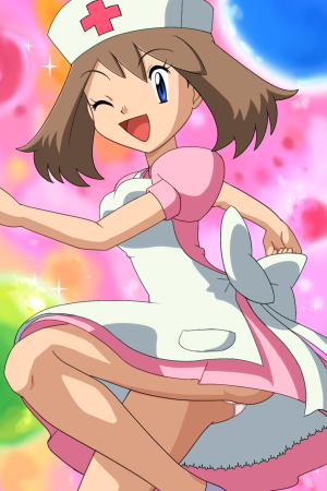 1girlalternate costumealternate headwearapronclothes liftcosplayfemale focushatjoy (pokemon) (cosplay)nursenurse capofficial alternate costumeone eye closedpantiespantyshotskirtskirt liftsmilesolounderwearupskirtwhite pantieswink