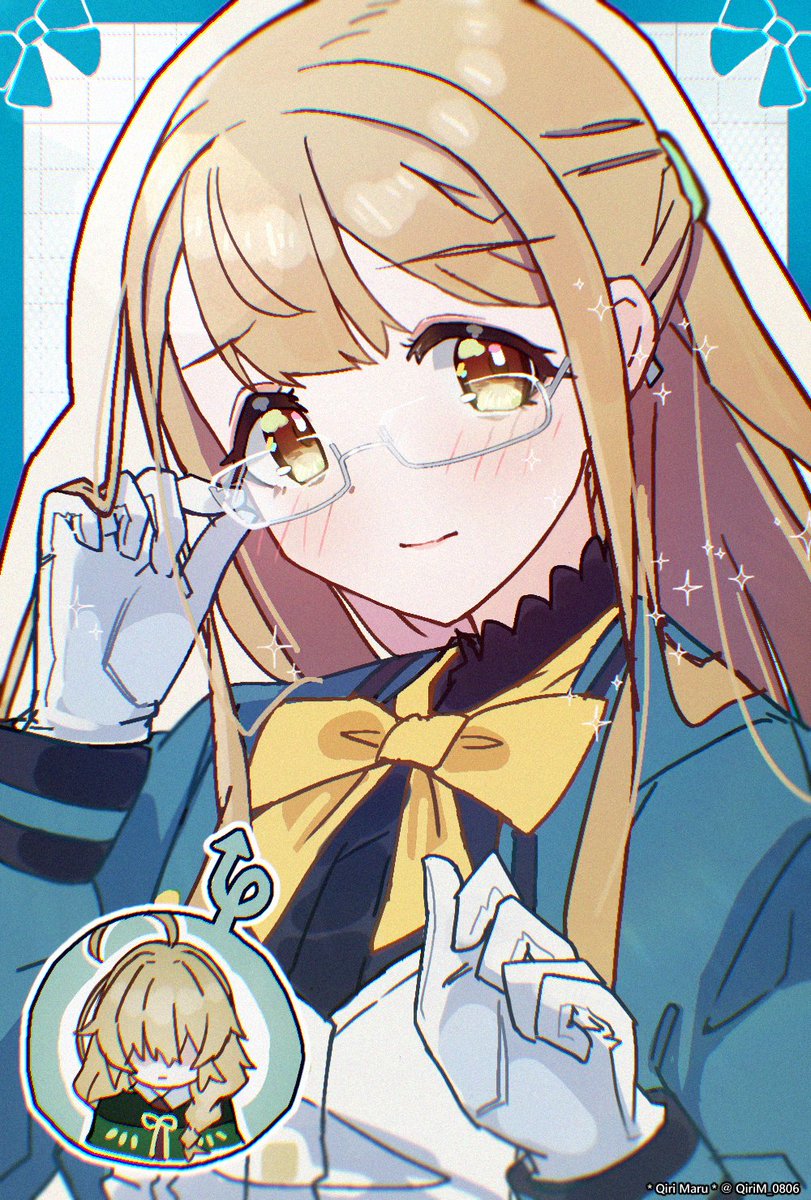 1girladjusting eyewearalternate hairstyleaqua jacketblushbrown eyesbrown hairchibichibi insetclosed mouthembarrassedeyebrows hidden by hairflat chestgloveshair over eyesjacketlipslong hairlooking at viewerrobeschool uniformsemi-rimless eyewearsolosparklevestwhite gloveswhite vest