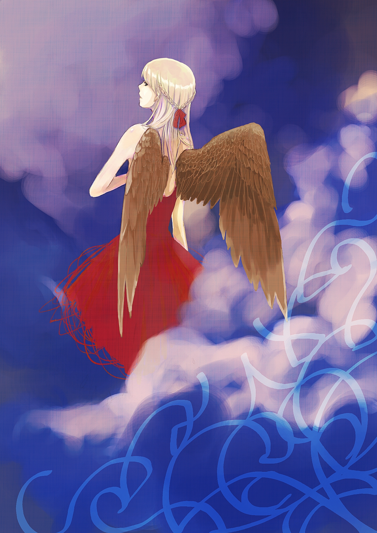 1girlbackless dressbackless outfitblonde hairbowclouddressfemale focusfrom behindhair bowhalf updolong hairlooking backred dresssolowings