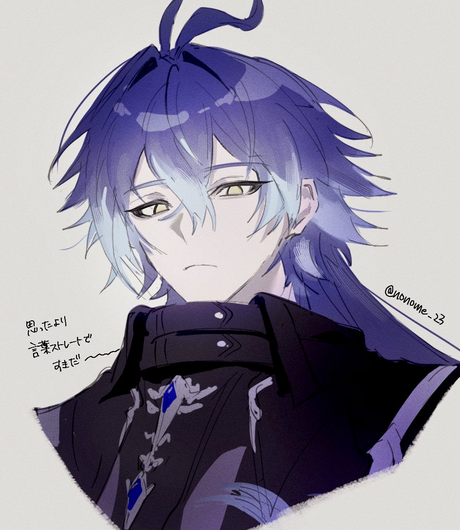 1boyantenna hairblack coatblue hairclosed mouthcoatcollared coatgradient hairhair between eyeshair intakeshigh collarlong hairlooking at viewermale focusmulticolored hairno pupilsnonome 23portraitsimple backgroundsolotwitter usernameyellow eyes