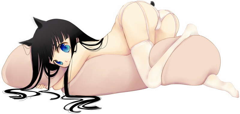 animal earsassblack hairblue eyescameltoecat earsgarter belthugging objectlong hairlyingpantiespillowpillow hugsolothighhighstopless femaleunderwearwhite panties