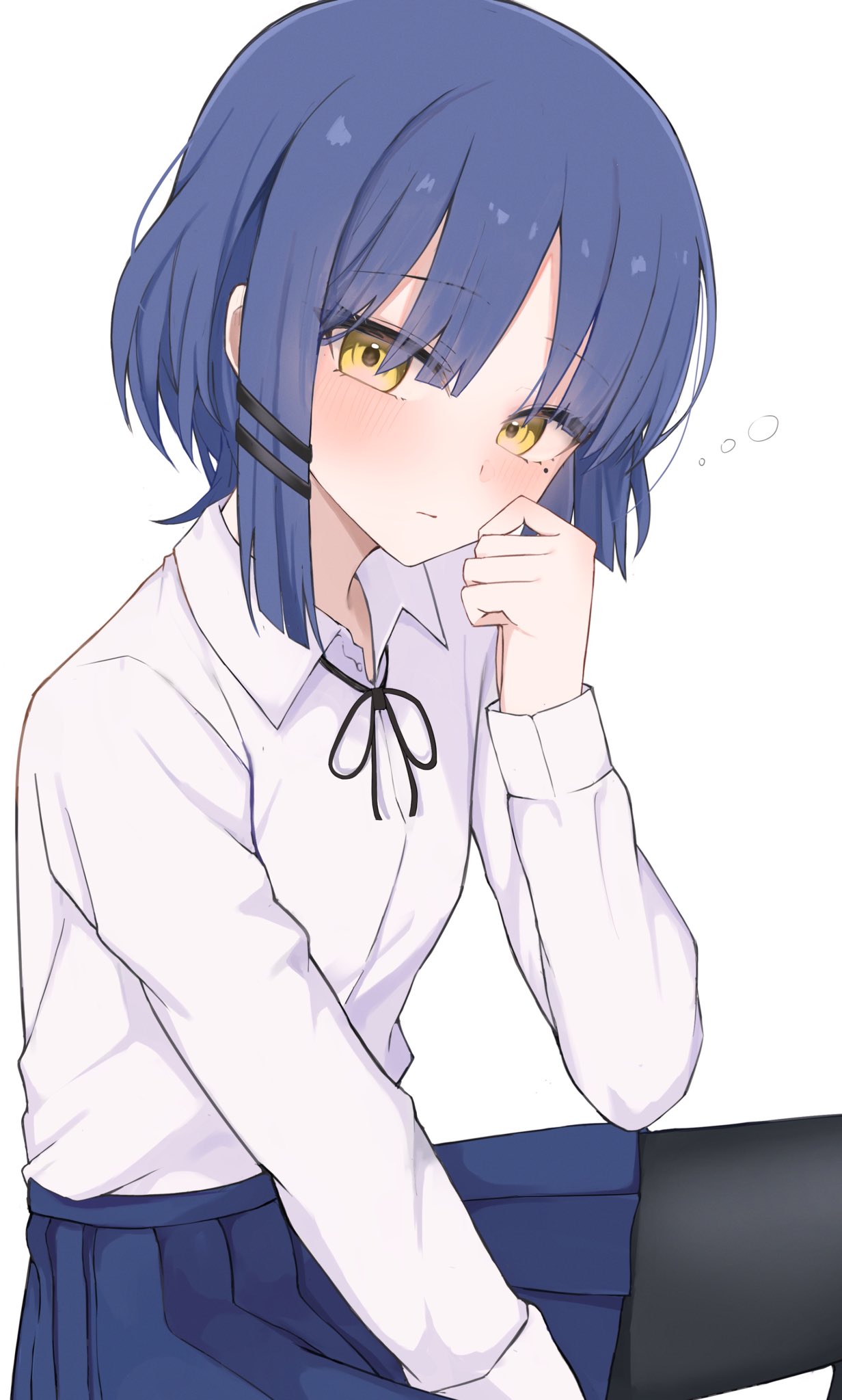 1girlbetween legsblack pantyhoseblack ribbonblue hairblue skirtblushdress shirtflat chesthair ornamenthaircliphand between legshand on own cheekhand on own facehand uplooking at viewermolemole under eyeneck ribbonpantyhoseparallel hairclipspleated skirtribbonshirtshirt tucked inshort hairsittingskirtsolosqueanswhite backgroundwhite shirtyellow eyes