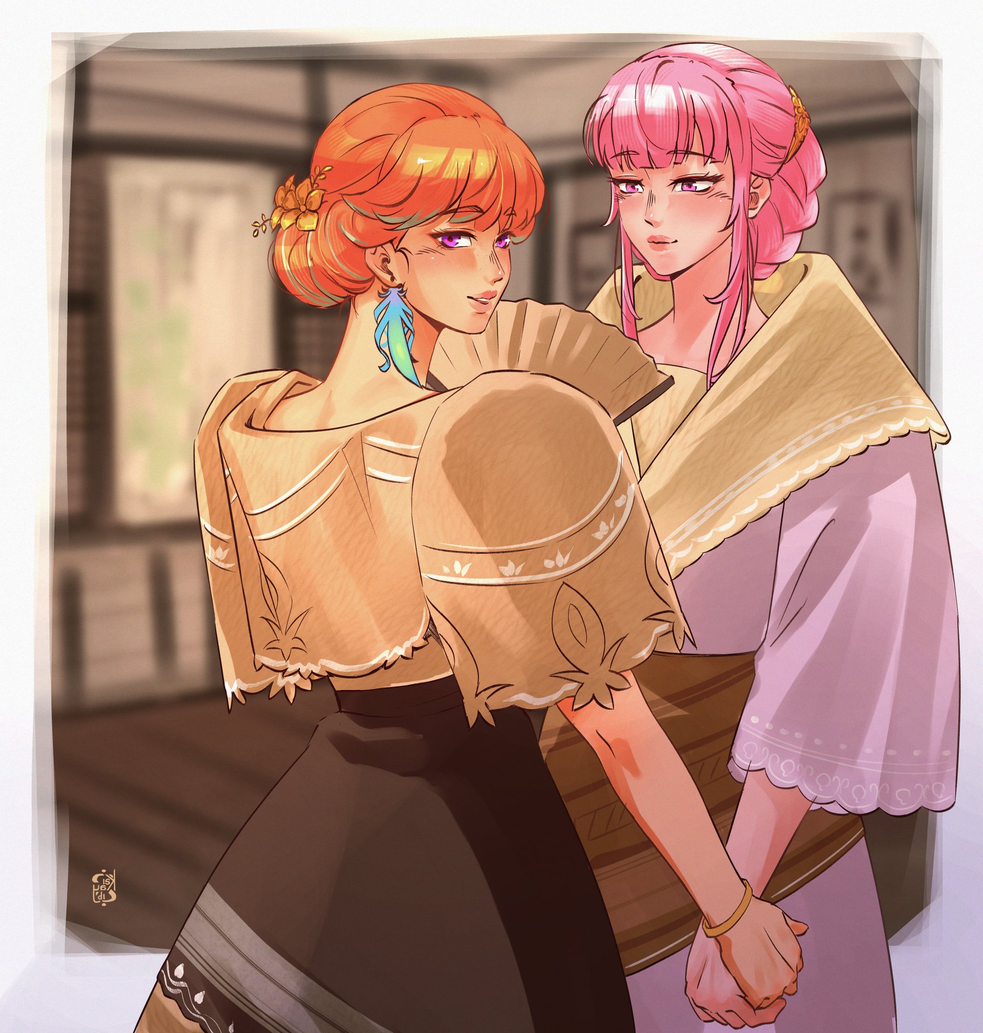 2girlsblushbreastsearringsfeather earringsfeathersgradient hairgreen hairholdingjewelrylong hairlooking at viewermulticolored hairmultiple girlsorange hairpink hairpurple eyessmilevirtual youtuberyuri