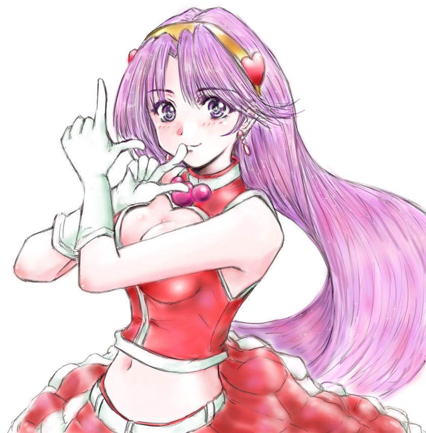 1girlbreastscleavage cutoutclothing cutoutdressearringsfemale focusgloveshairbandhands uphearthuge breastsjewelrylarge breastslong hairlooking at viewerpale skinpurple eyespurple hairskirtsmilesmiley face