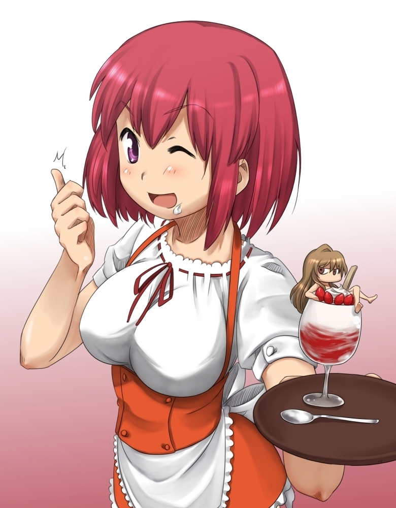 00s2girlsaproncupfoodgiantgiantessice creamin containerin cupin foodmini personminigirlmultiple girlsone eye closedparfaitshort hairsundaewaitresswink