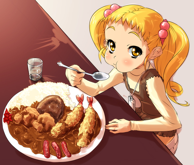 00s1girlblonde hairblushcrustaceancurryeatingeyelashesfemale focusfoodfood focusfull mouthhair bobbleshair ornamentholdingholding spoonlong hairricesauceshrimpshrimp tempurasolospoontempurayellow eyes