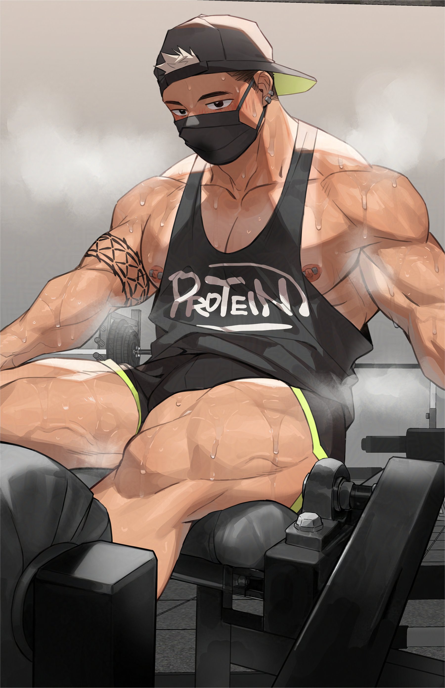 1boyarm tattoobackwards hatbarabaseball capbicepsblack eyesblack hairblack maskblack shortsblack tank topblushbroad shouldersearringsgymhatjewelrylarge pectoralsmale focusmulticolored hairnipple piercingpectoral cleavagepectoralspiercingshortssidepecsolosweattank toptattoothick armsthick thighsthighstwo-tone hairvery sweatywhite hair
