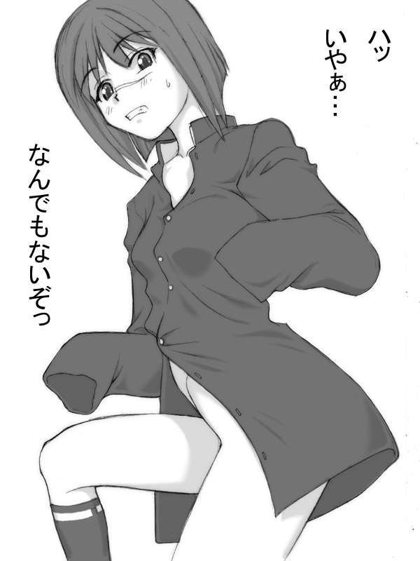 rami 1300, sunny (omori), omori, highres, 1boy, antenna hair, collared shirt, looking at viewer, male focus, monochrome, nervous sweating, parted lips, shirt, short hair, short sleeves, simple background, solo, sweat, sweater vest, teeth, upper teeth only, white background