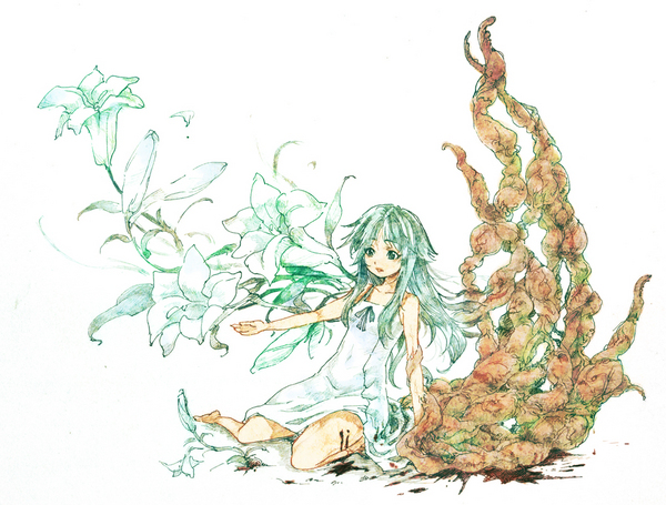 azuma kiyohiko, koiwai yotsuba, yotsubato!, absurdres, highres, scan, armadillo, child, copyright name, green eyes, green hair, quad tails, raglan sleeves, shorts, squatting, stick