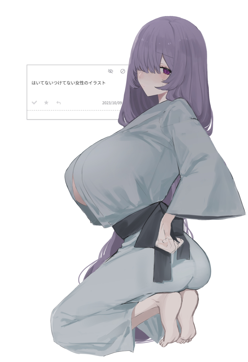 1girlbarefootblushbreastsclosed mouthfull bodygrey kimonohair over one eyehuge breastsjapanese clotheskimonokneelinglong bangslong hairlong sleeveslooking at viewerparted bangspurple eyespurple hairrequest insetsimple backgroundsketchsolovery long hairwhite backgroundwide sleeves