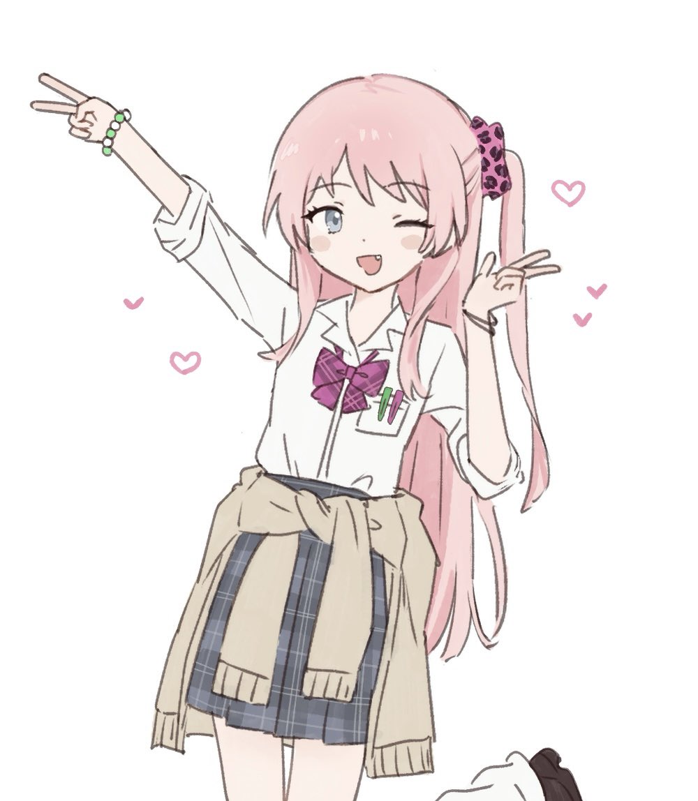 1girlblushbowbowtiebreast pocketbrown cardigancardigancardigan around waistclothes around waistfanggrey eyesgrey skirtgyaruhair ornamenthair scrunchieheartlong hairlooking at viewerone eye closedone side upopen mouthpink hairpink scrunchieplaid bowplaid bowtieplaid clothesplaid skirtpleated skirtpocketpurple bowpurple bowtieschool uniformscrunchieshirtsimple backgroundskirtsolovwwhite backgroundwhite shirt
