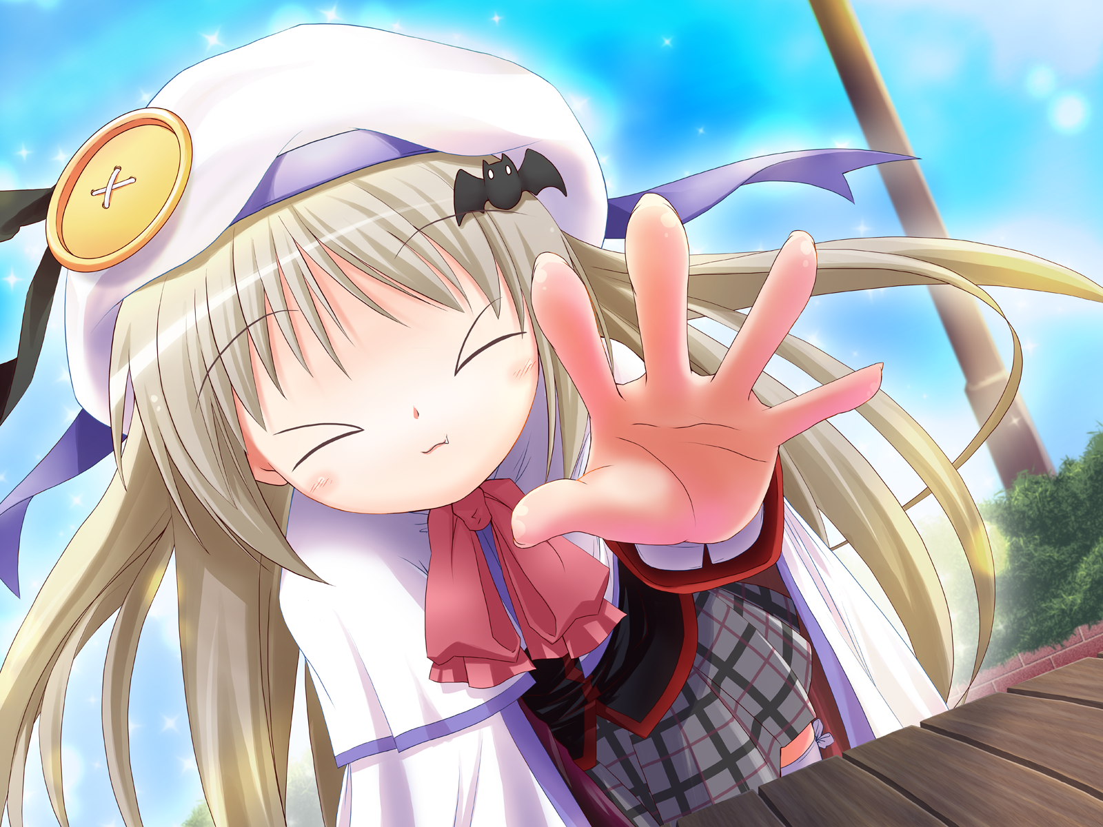 1boy1girlberetblonde hairblue eyesbowbuttonscapeclosed eyesfangfemale focushair ornamenthaircliphatlarge buttonslong hairoutstretched armoutstretched handpink bowplaid clothesplaid skirtreachingribbonschool uniformskirtsolo