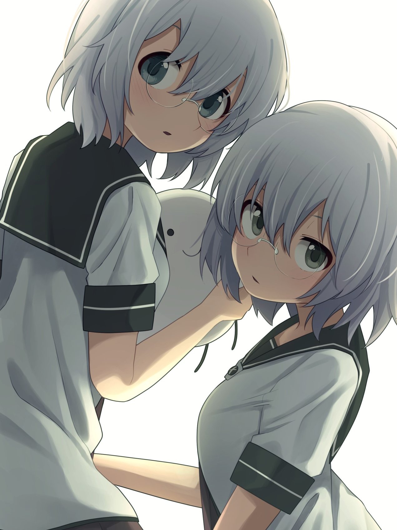 2girlsblack sailor collarblack trimblue eyesbreastsglassesgrey eyeshands upholdingholding stuffed toylight blushlooking at viewerlooking backmedium breastsmultiple girlsparted lipsrimless eyewearround eyewearsailor collarsailor shirtshadowshirtshort hairshort sleevessiblingssimple backgroundsistersstuffed toytaremetwinsupper bodywhite backgroundwhite hairwhite shirt