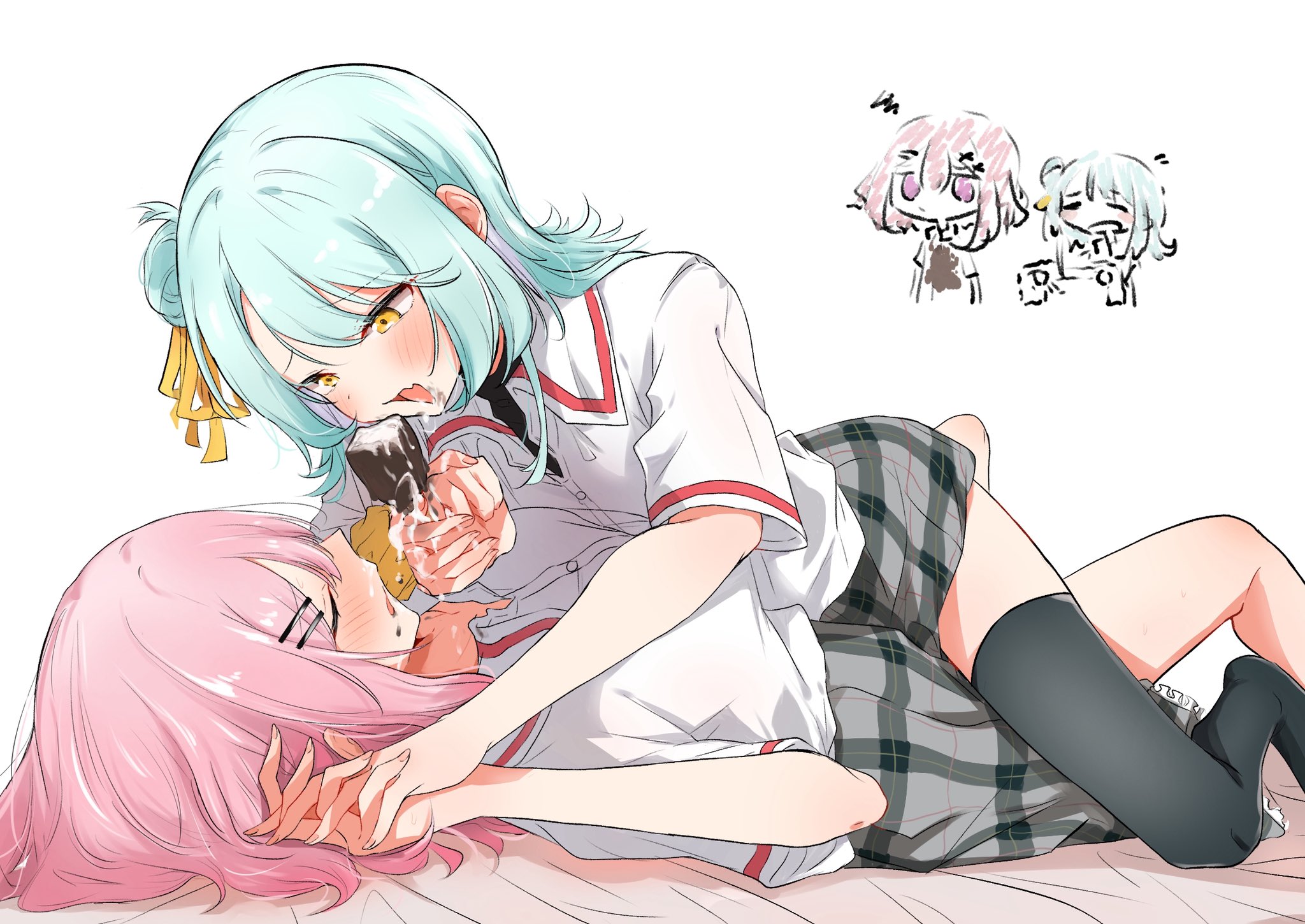 2girlsblack thighhighsblue hairblushclosed eyesfoodgrey skirthair bunhair ornamenthair ribbonhairclipholdingholding foodholding handsholding ice creamice creaminterlocked fingersmessy eatermultiple girlsnuooooodoomoopen mouthpink hairplaid clothesplaid skirtpleated skirtribbonshirtshort sleevessimple backgroundsingle side bunskirtstraddlingthighhighswhite backgroundwhite shirtyellow eyesyellow ribbonyuri