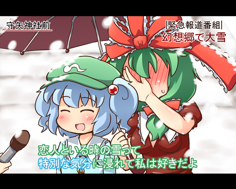 2girlsblue hairbowbreastscovering facefront ponytailgreen hairholdingholding microphonemememicrophonemultiple girlsred bowred ribbonribbonshared umbrellashyside-by-sidesmilesnowspecial feeling (meme)sweatumbrellayuri