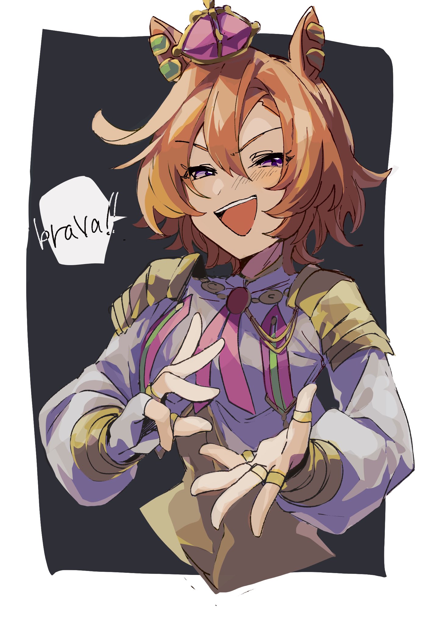 1girlanimal earsarmorblushbreastscrownear ornamentear piercingenglish texthair between eyeshorse earshorse girljewelrylong sleeveslooking at viewermini crownmultiple ringsopen mouthorange hairpiercingpink crownpurple eyesringshirtshort hairshoulder armorsimple backgroundsmilesolospeech bubbleteethupper bodyupper teeth onlywhite shirt