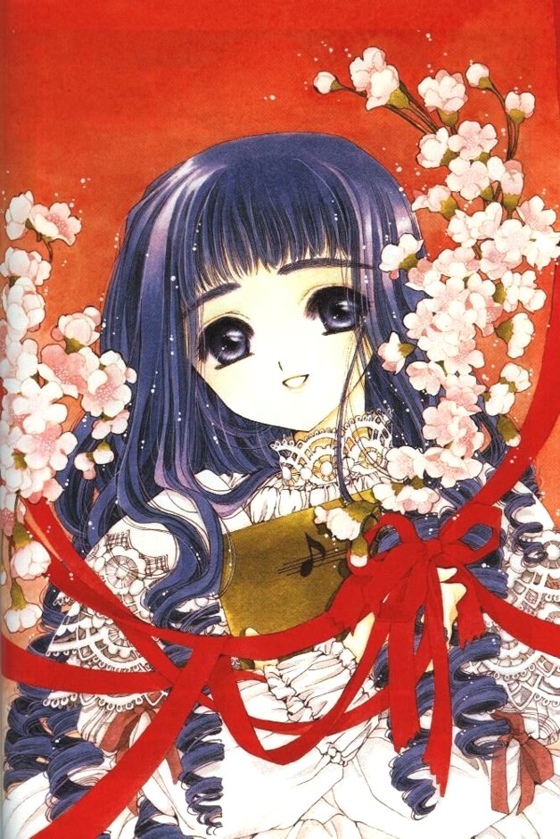 1990s (style)1girlblunt bangscherry blossomschildfemale focusflowerhead tiltlong hairorange backgroundpurple eyespurple hairred backgroundretro artstyleribbonsolo