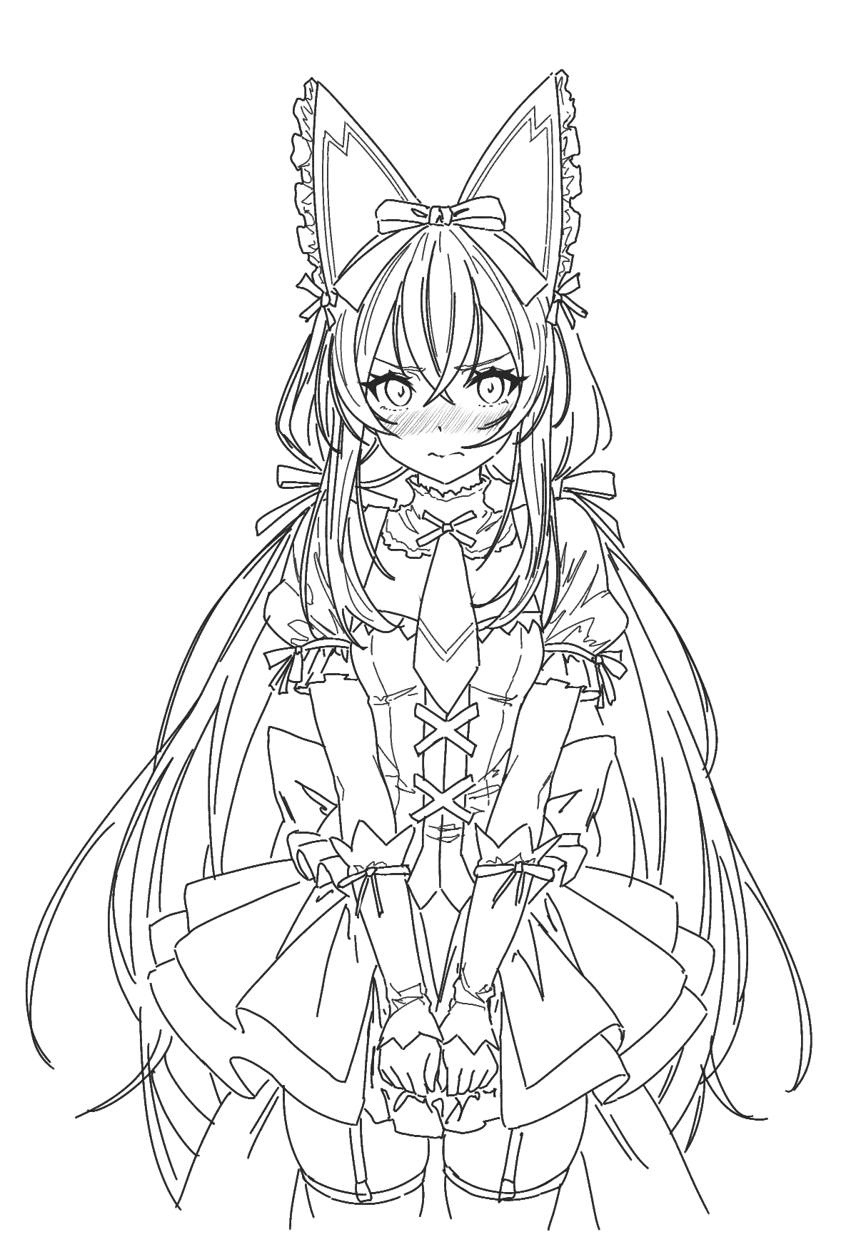 1girlblushbowbreastscosplaycowboy shotdouble-parted bangsembarrassedgarter beltgarter strapshair bowhair ribbonlineartlooking at viewermedium breastsmonochromenecktienose blushown hands togetherpuffy short sleevespuffy sleevesribbonshort sleevessidelockssimple backgroundthighhighstwintailswhite background