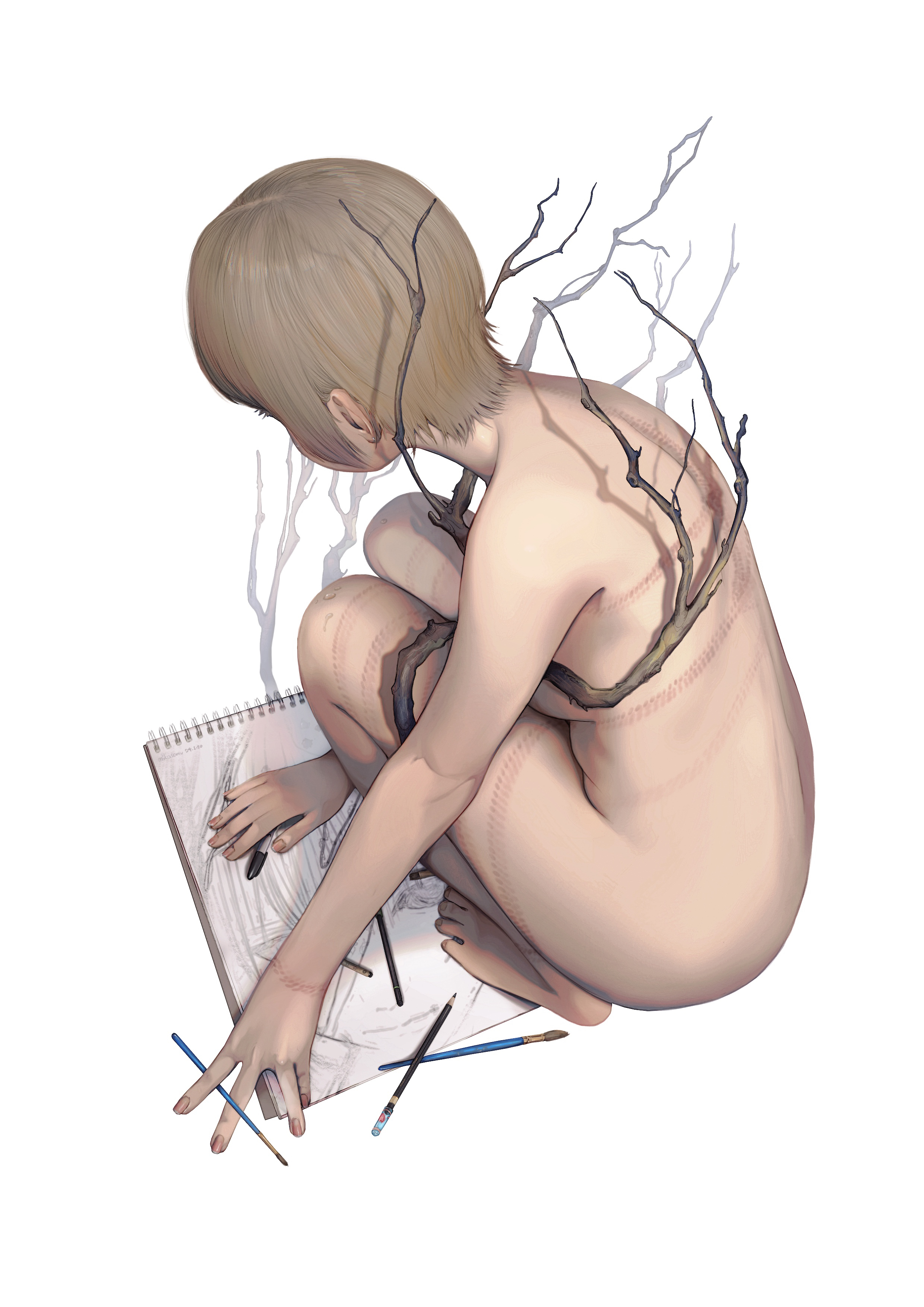 1girlartist nameblonde hairbranchcompletely nudedrawing (object)ear piercingfeetnudepaintbrushpencilpiercingshort hairsketchbooksolotoeswhite background