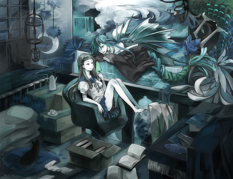 2girlsbarefootbookboxbraidchaircrescentdragon girlglobelong hairmonster girlmultiple girlspopsicleroomschool uniformsittingvery long hairwings