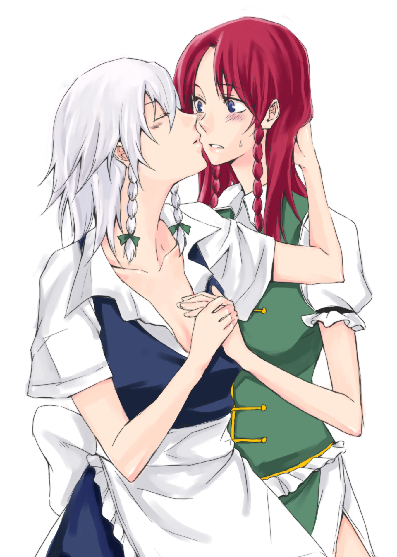 2girlsblue eyesblushbraidclosed eyesfemale focushair ribbonkisslong hairmultiple girlsopen clothesopen shirtred hairribbonshirtshort hairsurprisedtwin braidsyuri