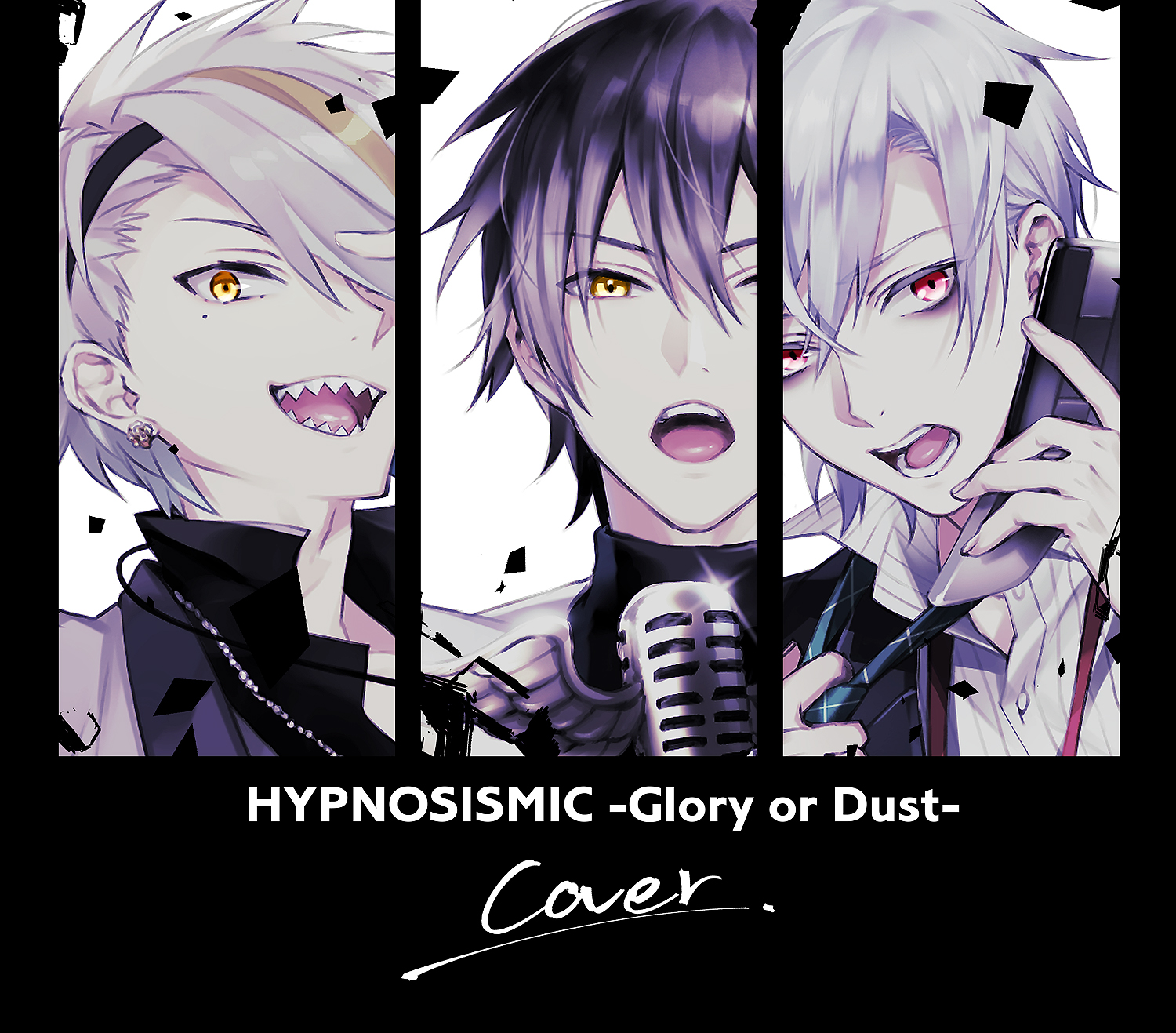 3boysadjusting clothesadjusting necktiealbum coverblack hairblack jacketblack shirtcellphonecollared shirtcoverear piercingearringsenglish textgreen necktiehair over one eyehairbandholdingholding microphone standholding phonejacketjewelrylimited palettelooking at viewermale focusmicrophonemicrophone standmolemole under eyemulticolored hairmultiple boysmusicnecklacenecktieopen mouthpale skinphonepiercingred eyessharp teethshirtsingingsmartphonesmilestreaked hairteethvirtual youtuberwhite backgroundwhite hairwhite jacketwhite shirtyellow eyes