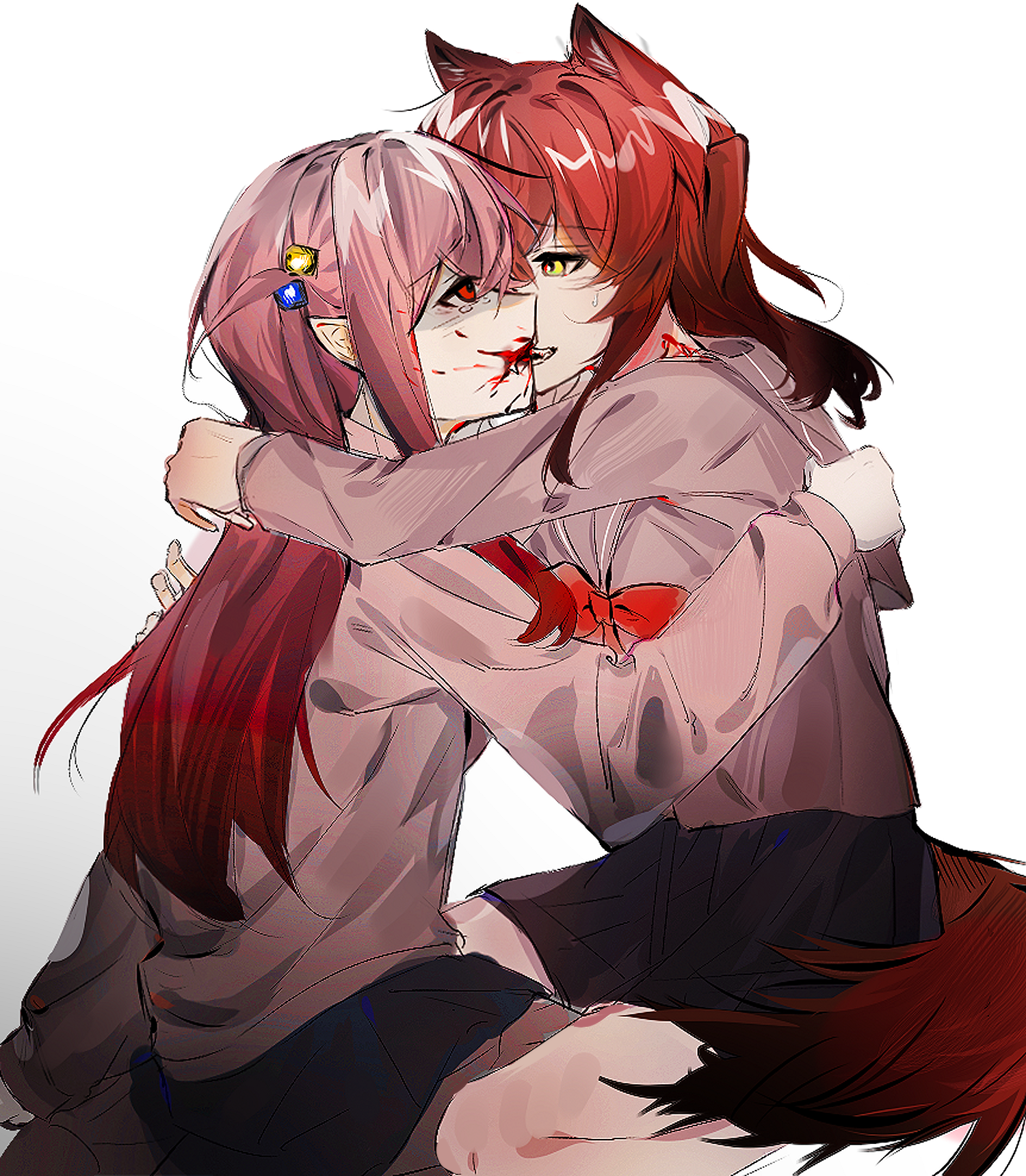 2girlsanimal earsarms around neckbloodblood on faceblood on neckbowbowtiecube hair ornamentfangsgradient backgroundgrey backgroundgrey shirthair ornamentjacketkemonomimi modelong hairlong sleevesmultiple girlsone side uppink hairpink jacketpointy earsred bowred bowtiered eyesred hairschool uniformshirtshuka high school uniformsweattailtearsvampirewhite backgroundwolf earswolf girlwolf tailyellow eyesyuri