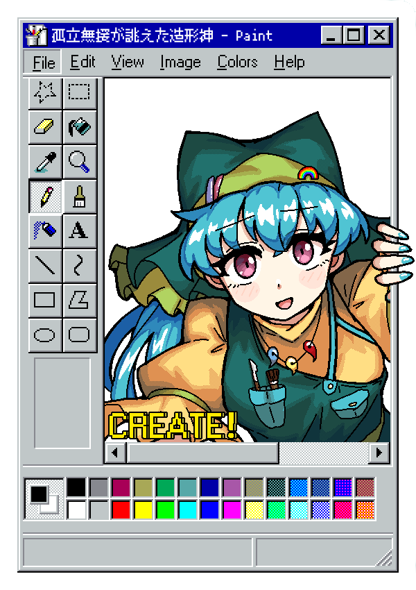 :d1girlapronblue hairflying sweatdropsgreen aprongreen hathatheadscarflong hairlooking at vieweropen mouthpaint.net (medium)pink eyespurple backgroundrainbow hat ornamentshort sleevessimple backgroundsmilesoloupper bodyuser interface