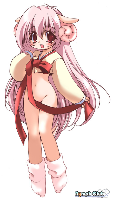animal earsblushbottomlessbowchibihornslolilong hairpink hairred eyesribbonsheep earssimple backgroundsockssolo