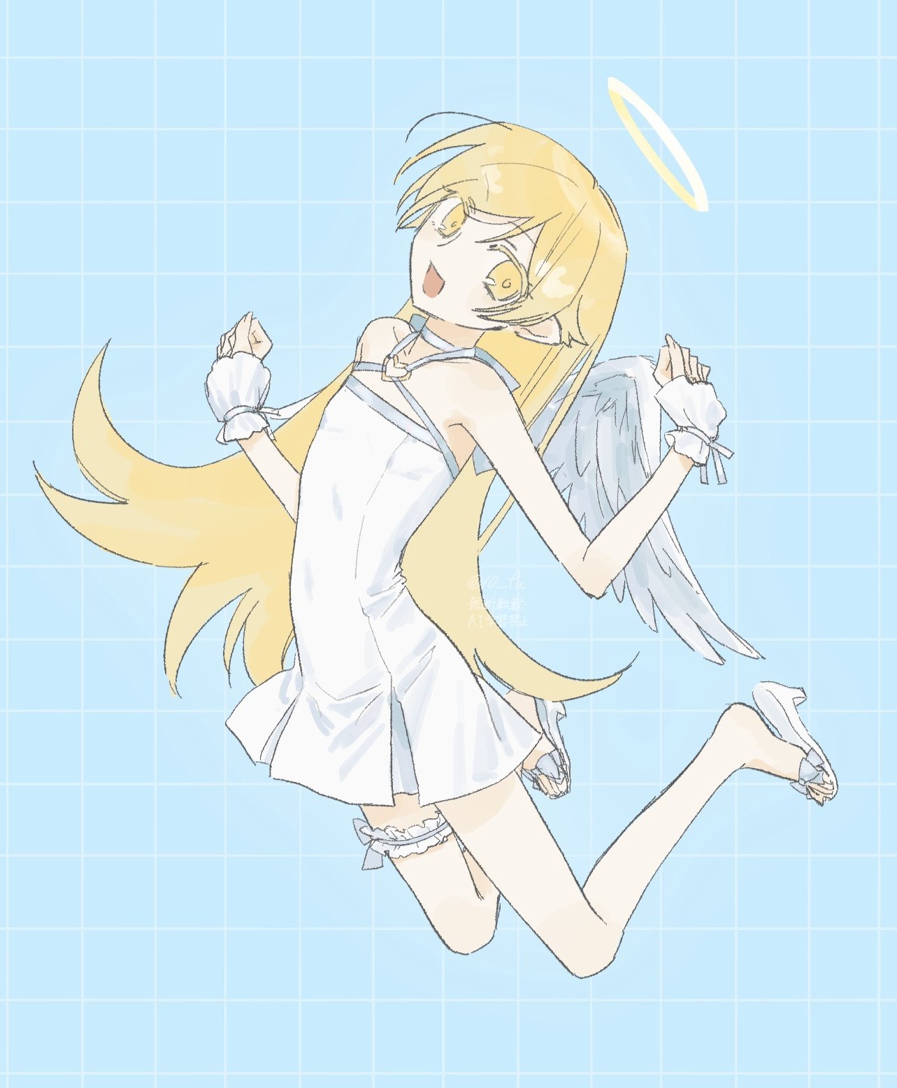 10 fu1girlangel wingsblonde hairdressflat chestfrilled thigh strapfull bodyhalolong hairlooking at vieweropen mouthsmilesolothigh strapwhite dresswingsyellow eyes