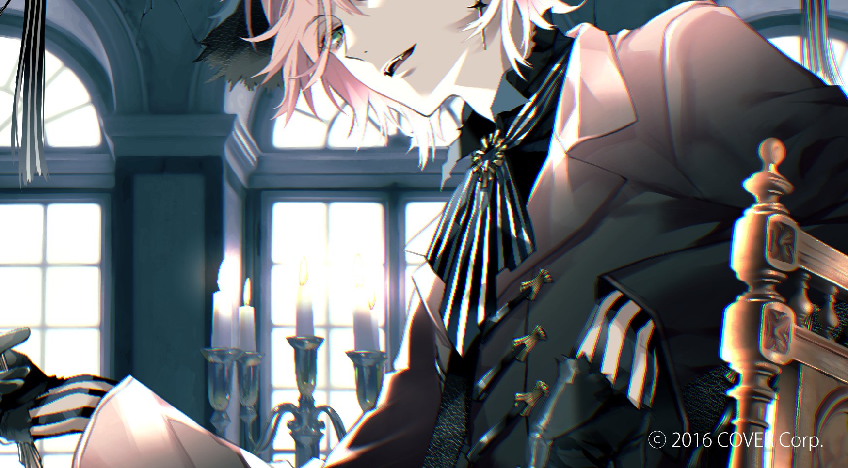 1boyanimal earsascotbishounenblack ascotblack glovesblack shirtbroochbrown coatcandlecandlestandchairchromatic aberrationcoatcollared shirtcopyright noticeearringsfangsformal clothesglovesgreen eyeshair between eyesindoorsjacketjewelrylong sleeveslooking at viewermale focuson chairopen mouthpink hairribbonshirtshort hairsittingsmilesolostriped clothessuitteethupper bodyvertical-striped clothesvirtual youtuberwindow