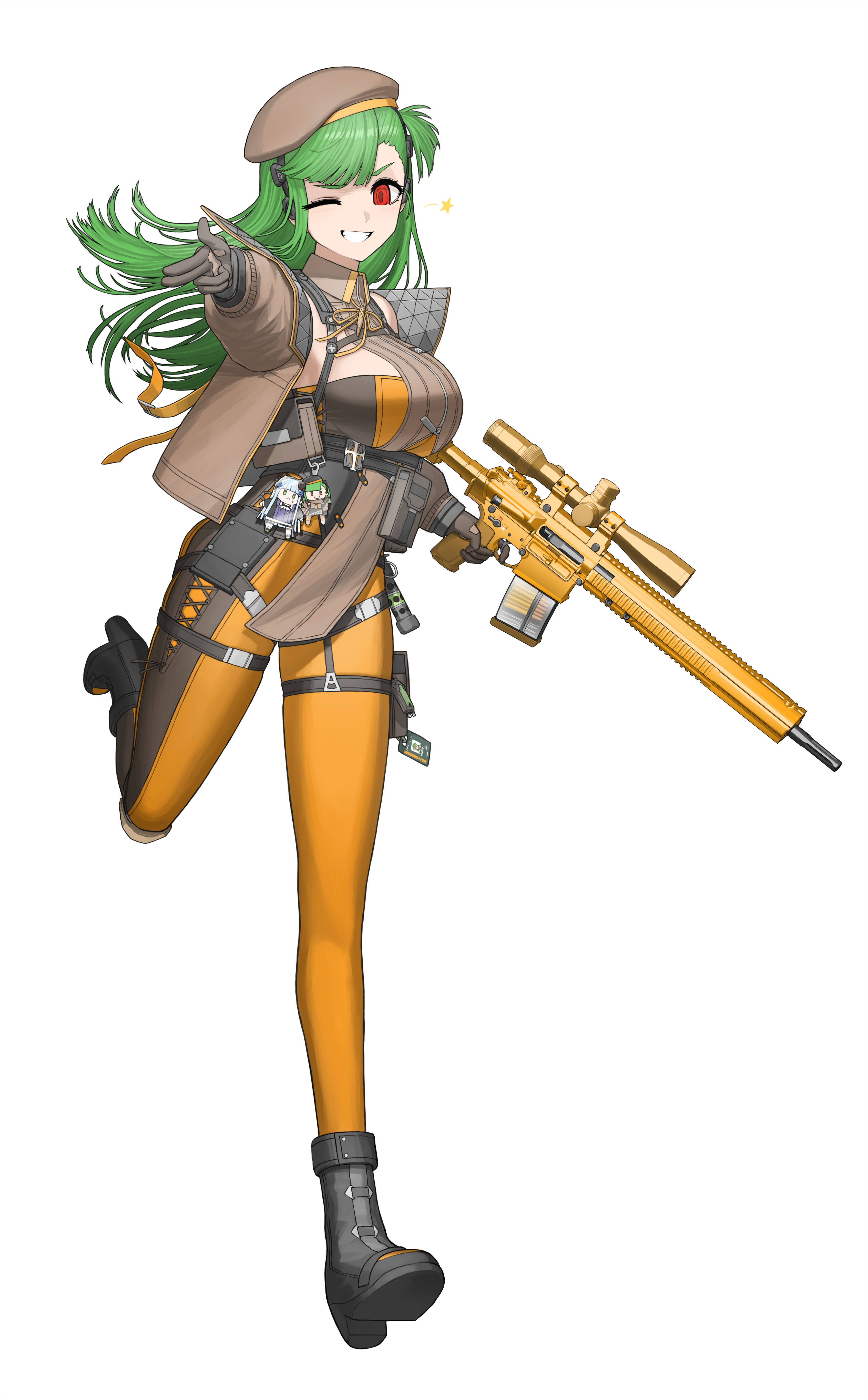 1girlaimingaiming at viewerbootsbreastsclenched teethglovesgreen hairhatholdingholding weaponjacketlarge breastslong hairone eye closedopen mouthpantsred eyesskindentationsolostandingstanding on one legtam o' shanterteeththigh strapvery long hairweaponyellow pants