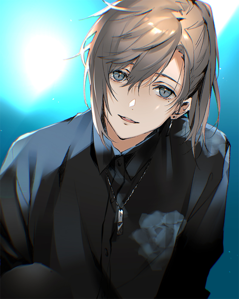 :d1boyblack shirtblue backgroundblue eyesblurrybrown haircollared shirtdog tagsdress shirtear piercingearringsgrey eyeshair between eyesjacketjewelrylong hairlong sleeveslooking at viewermale focusmolemole under eyenecklaceopen mouthparted lipspiercingponytailshirtsmilesoloteethupper bodyupper teeth onlyvirtual youtuber