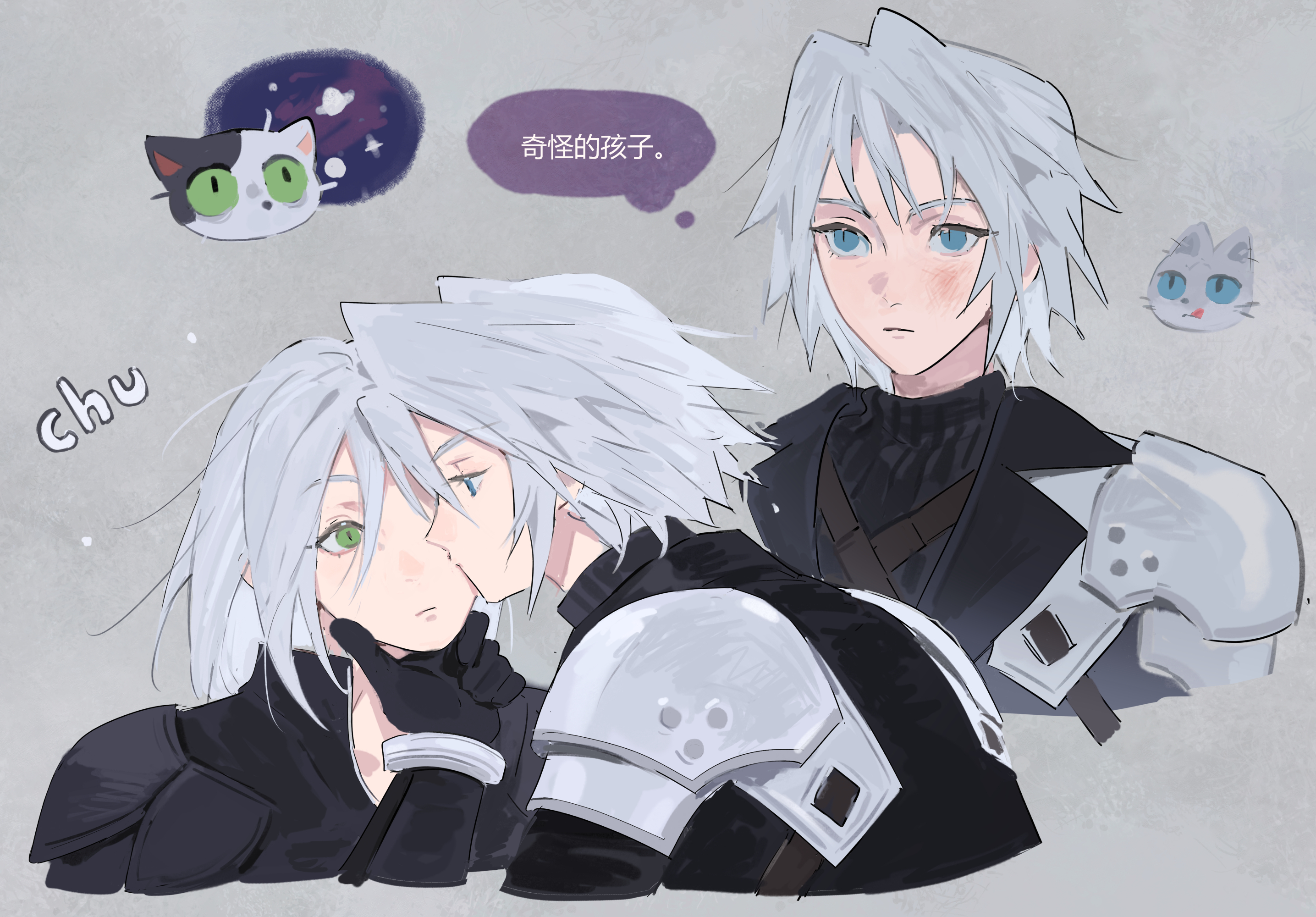 2boysanimalizationarmorblack coatblack glovesblack sweaterblue eyesbracercatchest strapchinese textcoatcropped torsoexpressionlessglovesgrabbing another's chingreen eyesgrey backgroundgrey hairhair between eyeshand on another's chinkisskissing cheekmale focusmedium hairmultiple boysparted bangspauldronsshort hairshoulder armorslit pupilsspeech bubblesweaterthought bubbletime paradoxturtleneckturtleneck sweateryaoi