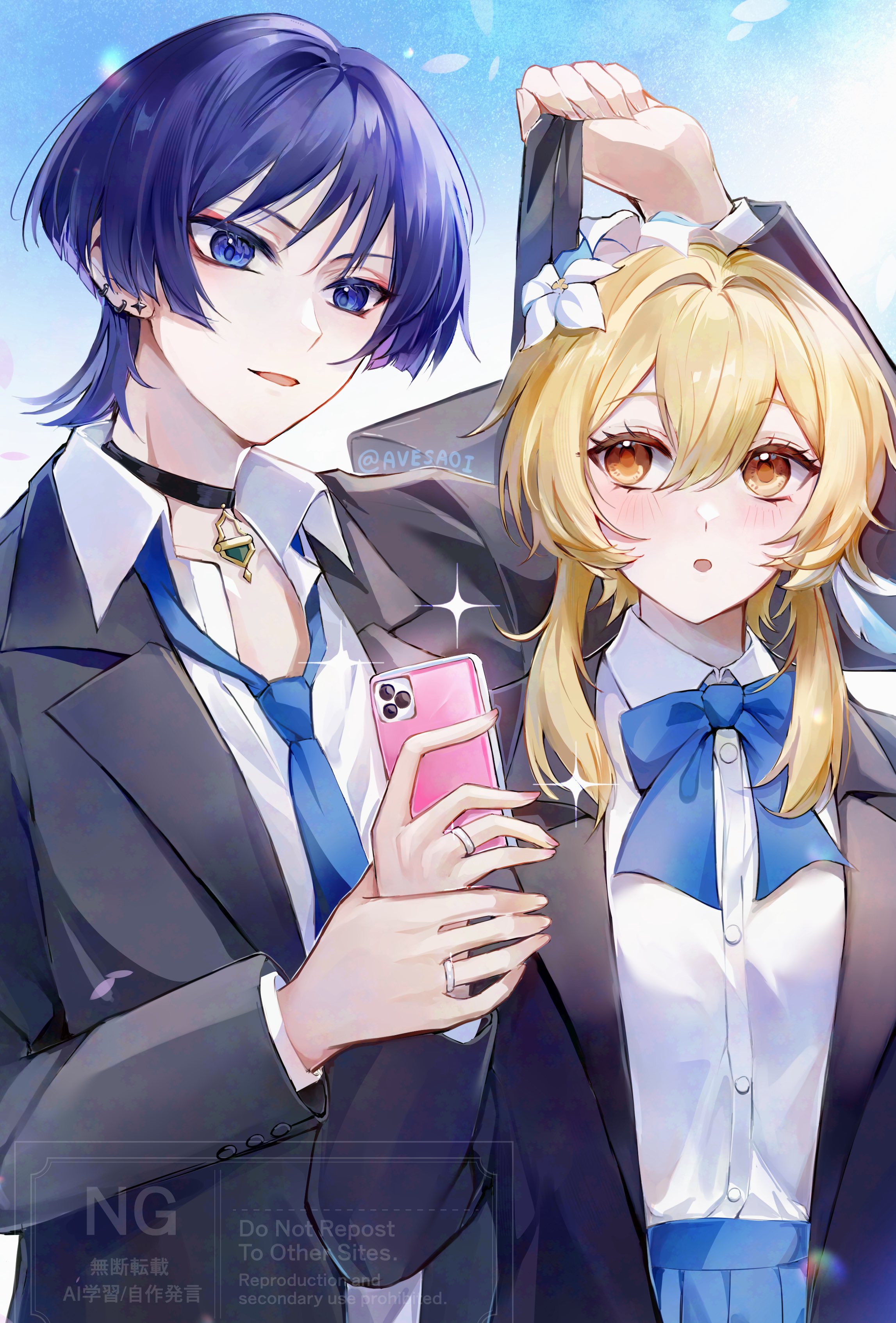 1boy1girlalternate costumearms behind headarms upbagblack bagblack chokerblack jacketblack sleevesblazerblonde hairblue bowblue bowtieblue skirtblue skyblunt endsblushbowbowtiebrown eyeschokerclear skycollarbonecollared shirtcontemporaryear piercingearringsengagement ringseyelasheseyelinereyeshadowfeather hair ornamentfeathersflowerhair between eyeshair flowerhair intakeshair ornamentheight differenceholdingholding another's wristholding bagholding phonejacketjewelrylapelslarge bowlayered sleeveslong sleeveslooking at anothermakeupopen clothesopen jacketopen mouthoutdoorsphonepiercingpink nailspleated skirtpurple eyespurple hairred eyelinerred eyeshadowschool uniformshirtshort hairshort hair with long lockssidelockssideways glanceskirtskytsurimetwitter usernameundershirtupper bodywatermarkwhite featherswhite flowerwhite shirtwhite sleeveswispy bangs